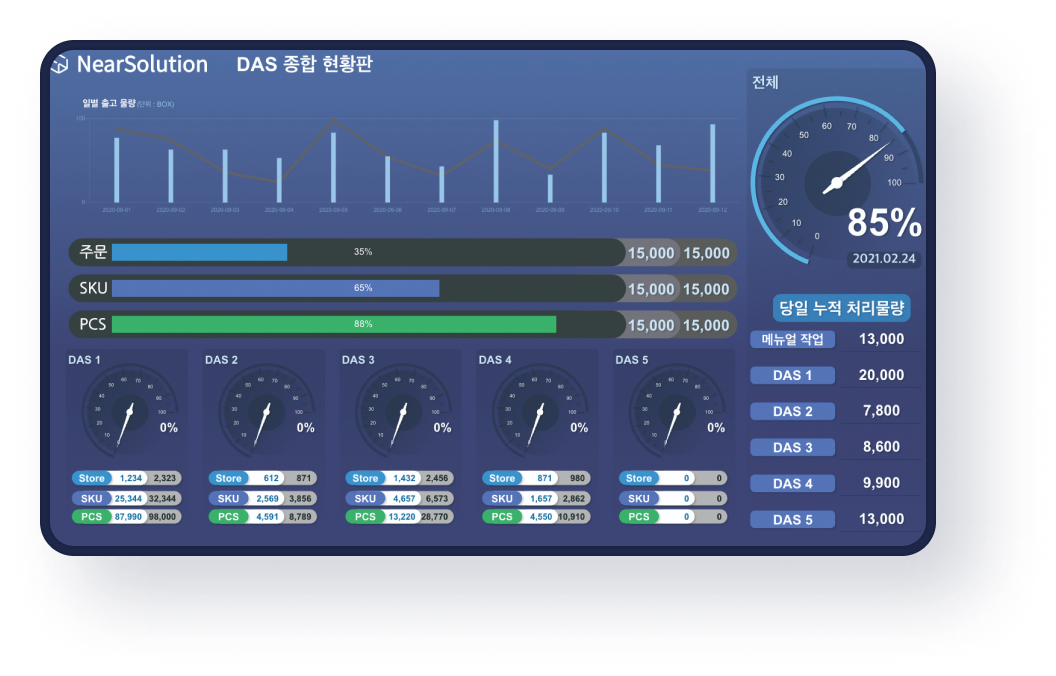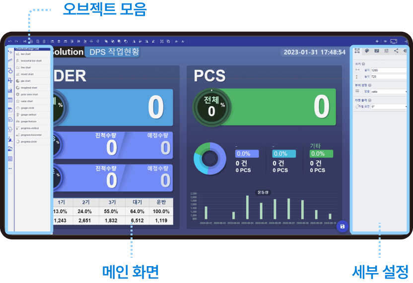 단위 레이아웃의 작업 진척률과일 별 작업량, 생산성 등 현황을 시각화합니다.